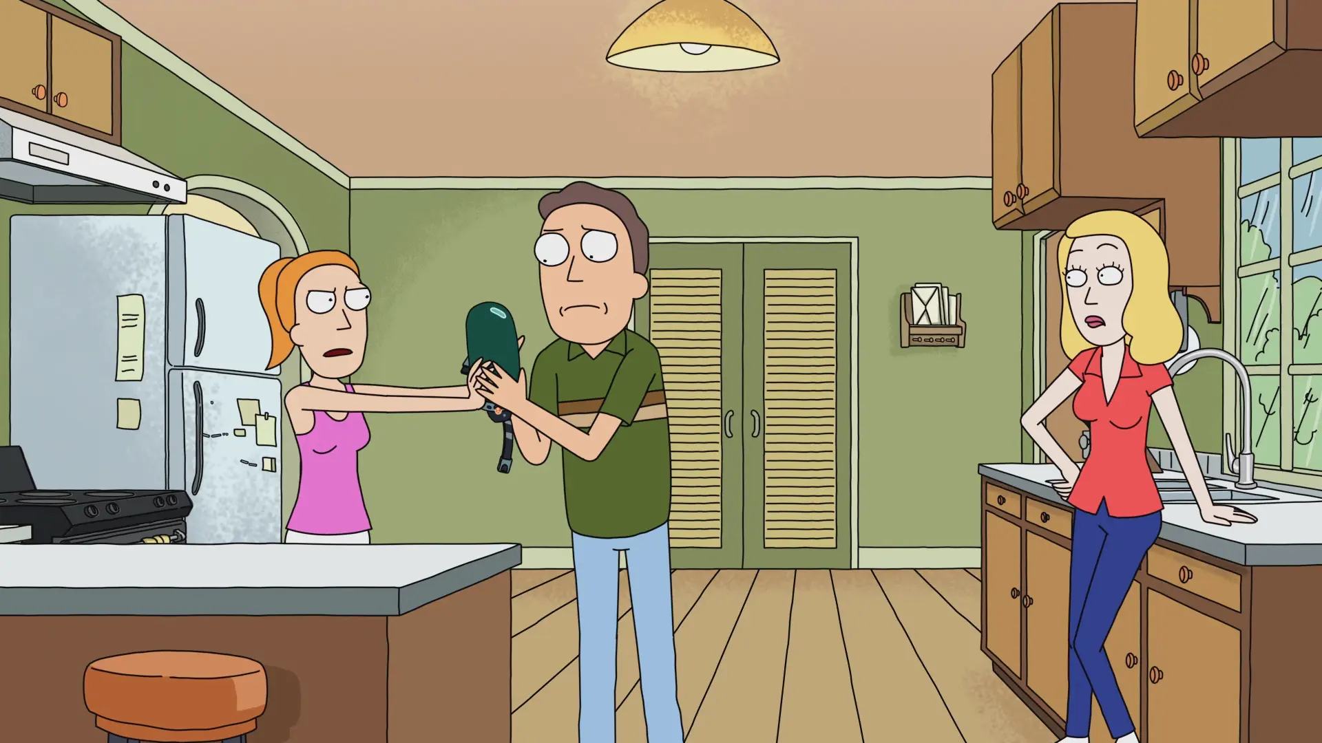 OriginalНе ўражаны тым, што паказваюць па тэлевізары, Рык усталёўвае кабельнае тэлебачанне, якое дазваляе бачыць перадачы з іншых вымярэнняў. Усе карыстаюцца спецыяльнымі акулярамі, каб бачыць сваё альтэрнатыўнае «я».